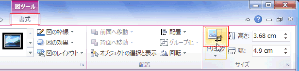 - 「図ツール」リボンの[書式]タブのサイズグループにある[トリミング]を実行します。