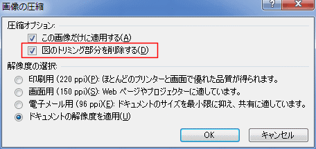 - 圧縮オプションの「図のトリミング部分を削除する」にチェックを入れて、[OK]ボタンをクリックします。
