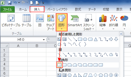 [挿入]タブの[図]グループの[図形]→[正方形/長方形]を選択しました。