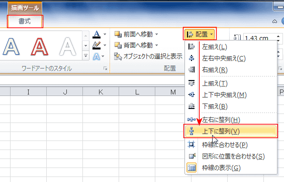 - 描画ツールの[書式]タブで[配置]グループにある[配置]→[上下に整列]を実行します。