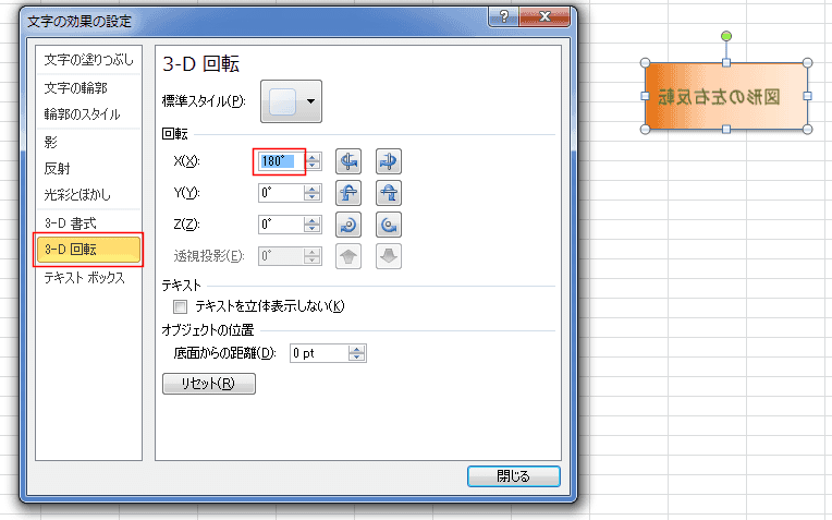 - [3-D 回転]を選択して、回転の Xを180°とします。