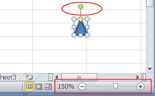 下図はExcel2010の右下に表示されるズームスライダーを使って、表示倍率を150% にした例です。
