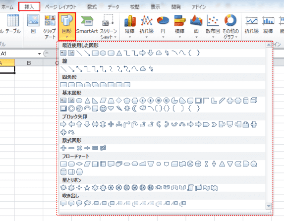 Excel2003以前では「オートシェイプ」と呼ばれていましたが、Excel2007以降では「図形」と名称が変わっています。