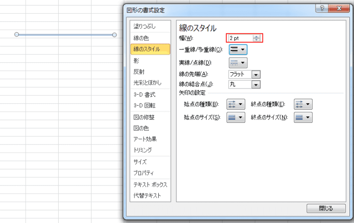 - 「図形の書式設定」ダイアログボックスで、幅を「2pt」以上にし、一重線/多重線で「二重線」を選択します。