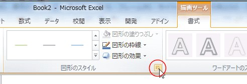 - 描画した直線を選択して、描画ツールの[書式]タブで[図形のスタイル]グループにあるダイアログボックス起動ツールをクリックします。