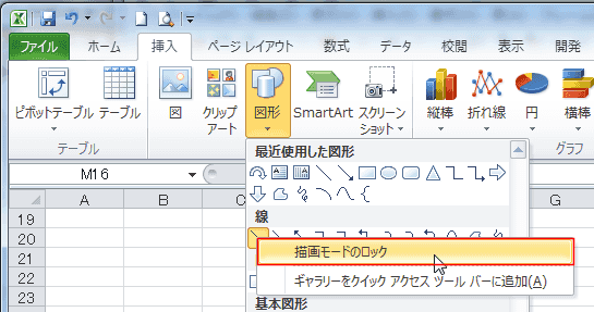 - 直線を連続して描きたいときは、図形を右クリックして「描画モードのロック」を実行します。