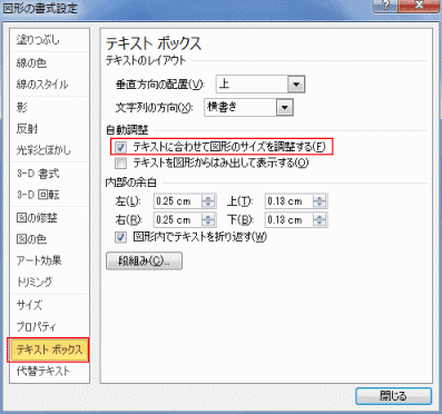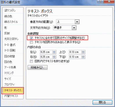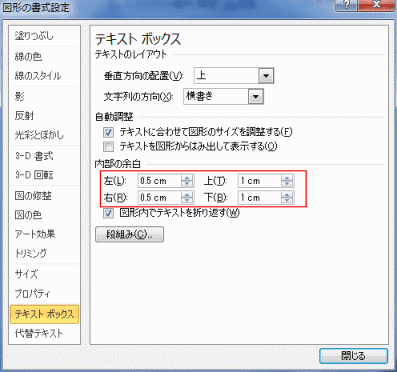 | テキストボックスの書式設定を変更したい | テキストボックスの内部の余白を設定する |