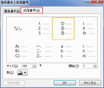 - 「段落番号」タブを選択し、使用するものを選択します。