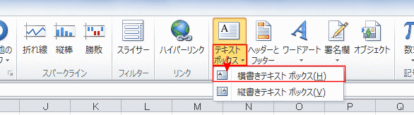 - [挿入]タブの[テキスト]グループにある[テキストボックス]→[横書きテキストボックス]を実行します。