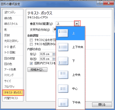 [テキストボックス」を選択して、垂直方向の配置で選択します。