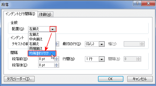- 配置で「均等割り付け」を選択します。