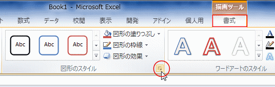- 描画ツールの[書式]タブを選択し、「図形のスタイル」グループにあるダイアログボックス起動ツールをクリックします。
