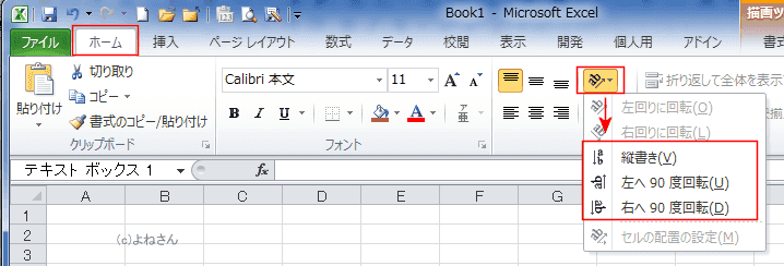 よねさんのExcelとWordの使い方|エクセル2010基本講座:目次|テキストボックスの操作|テキストボックスの文字の方向