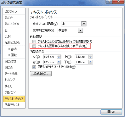 [テキストボックス」を選択して、「テキストを図形からはみ出して表示する」のチェックを外します。