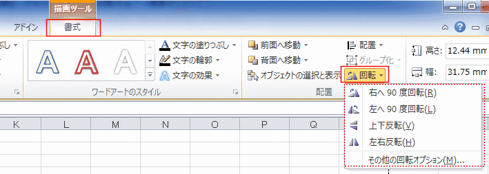 - 描画ツールの[書式]タブの[配置]グループの「回転」コマンドを使って設定します。