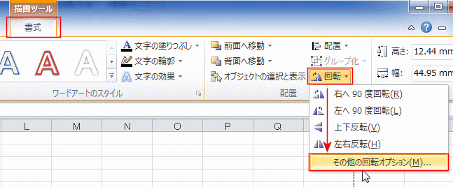 - 描画ツールの[書式]タブの[配置]グループの[回転]→[その他の回転オプション]を実行します。