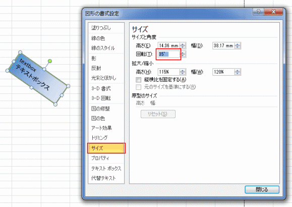 サイズと角度の回転で角度を指定します。下図では「35°」としています。