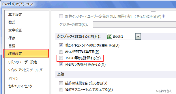 - [詳細設定]を選択し、次のブックを計算するときは にある「1904年から計算する」にチェックを入れます。