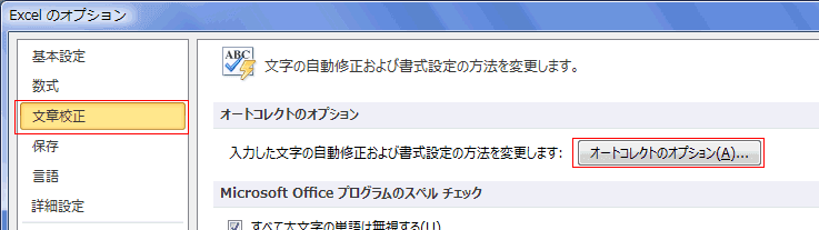 - 「文書校正」を選択して[オートコレクトのオプション]ボタンをクリックします。
