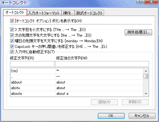 - [オートコレクト]タブを選択しました。