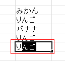 - 例えば、下図のようなデータで「り」と入力すると、「りんご」を表示されます。このまま[Enter]キーを押すと「りんご」が入力されます。