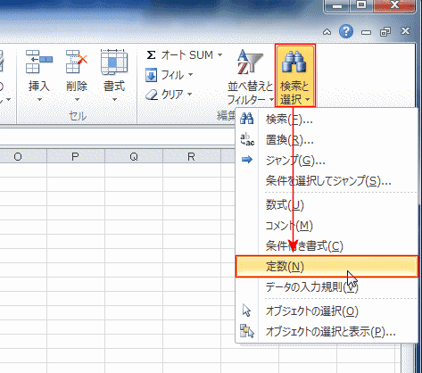 - [ホーム]タブの[編集]グループにある[検索と選択]→[定数]を選択します。