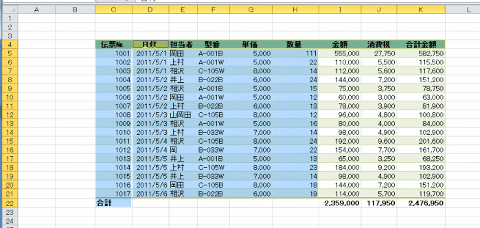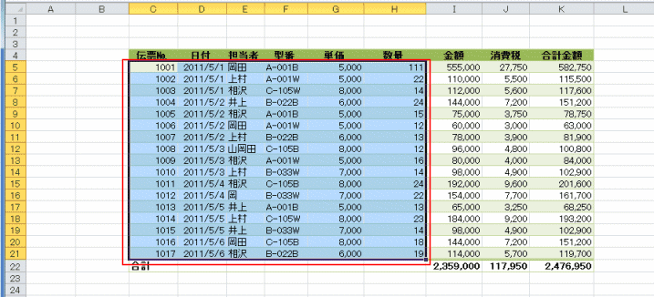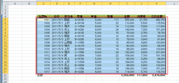 - データ行のみを選択します。下図では5行目〜21行目を選択しています。