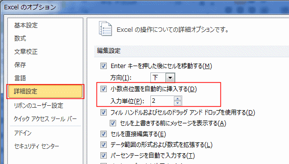 - [詳細設定]の「小数点位置を自動的に挿入する」にチェックが入っていて、入力単位に設定がある時にこれらの現象が起きます。