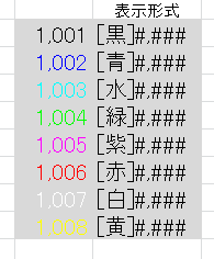 - セルの表示形式で [色n] #,### と設定することもできます。