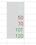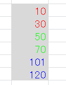- 100を超える値は青、50未満の数値は赤、それ以外は緑 に設定しています。