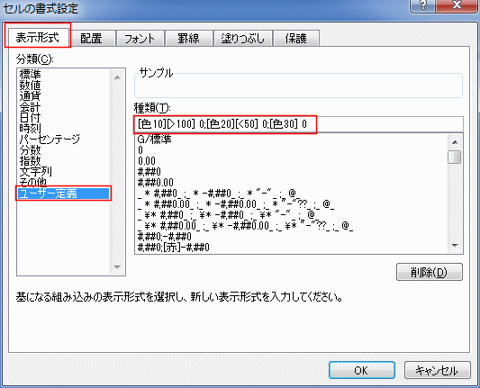 [青][>100] 0;[赤][<50] 0;[緑] 0 と設定した例です。