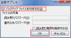 - 「バックアップ ファイルを作成する」にチェックを入れ、[OK]ボタンをクリックします。
