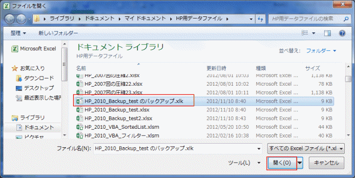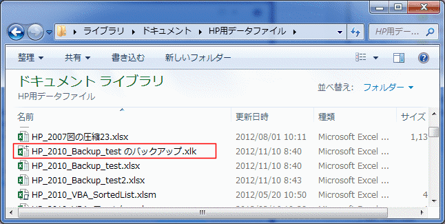 保存場所は元ファイルと同じ場所で、ファイルは「・・・・のバックアップ.xlk」となります。拡張子も「.xlk」と異なります。