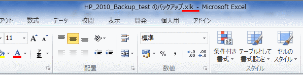 - バックアップファイルが開きました。拡張子が「.xlk」となっています。