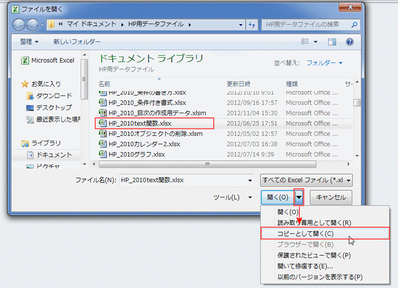 - ファイルを選択し、開くボタンの[▼]ボタンをクリックして[コピーとして開く]を実行します。