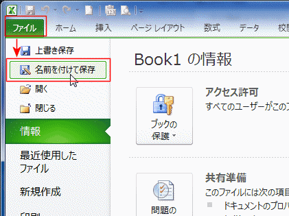 - Excel2010でファイルタブの名前を付けて保存します。
