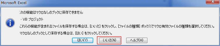 - 「次の機能はマクロなしのブックに保存できません」と表示されます。