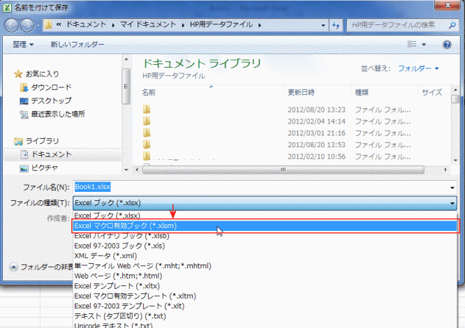 - ファイルの種類が「Excelブック(*.xlsx)」となっているので、「Excelマクロ有効ブック(*.xlsm)」に変更します。