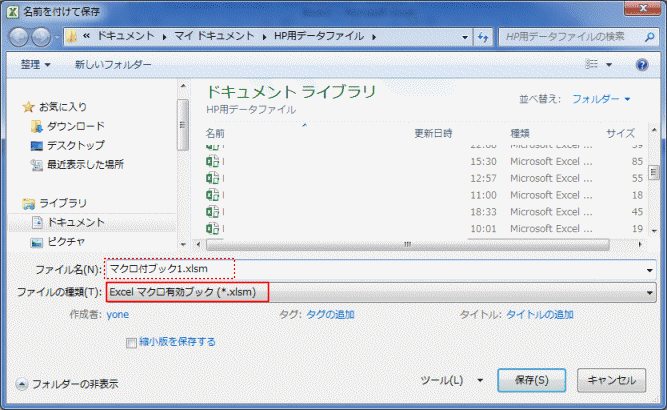 - ファイルの種類が「Excelマクロ有効ブック(*.xlsm)」となっているのを確認して、ファイル名を入力してから[保存]ボタンをクリックします。