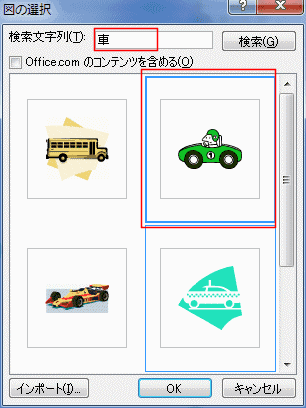 - 検索文字列に「車」と入力して、下図のクリップアートを選択しました。