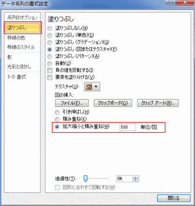 - データ系列の書式設定ダイアログで、「拡大縮小と積み重ね」にチェックを入れ、「500」単位/図としました。