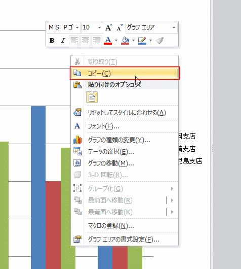 - グラフシートのグラフのグラフエリアを右クリックし、[コピー]を選択します。