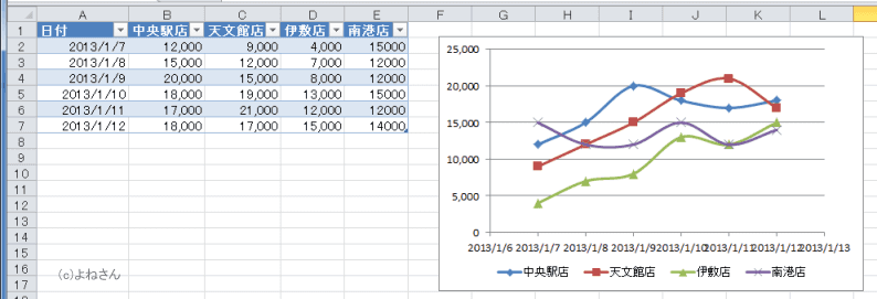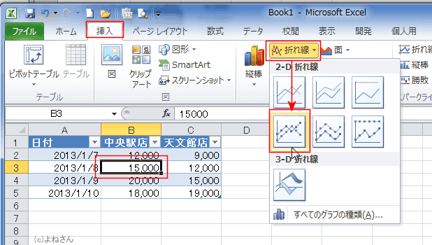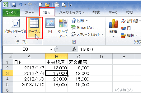 よねさんのExcelとWordの使い方|エクセル2010基本講座:目次|グラフの使い方|グラフの参照範囲を自動的に変更したい(テーブル機能)