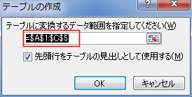 - データリスト内のセルを選択して、[挿入]タブの[テーブル]を実行します。