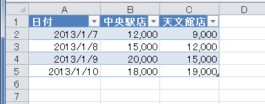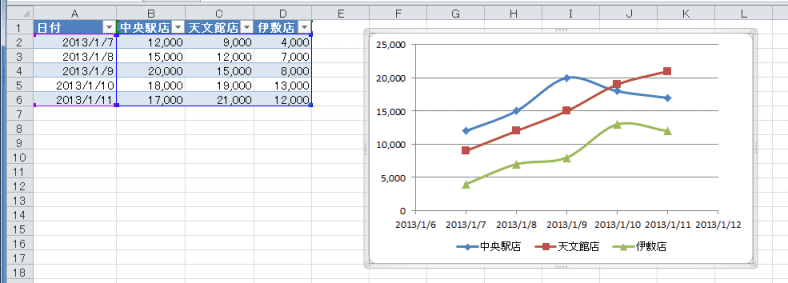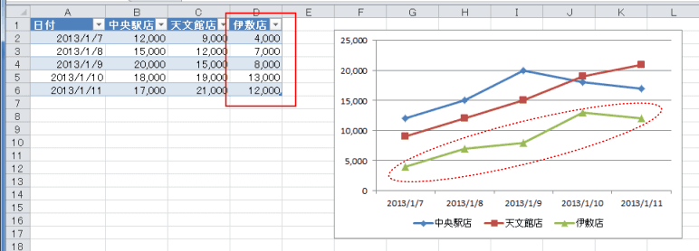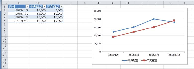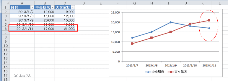 テーブルの範囲が自動で拡張されています。またグラフにも追加したデータが反映されました。