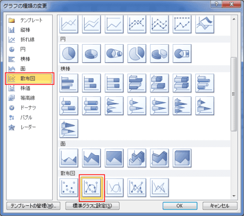 - [散布図]を選択して、[平滑線とマーカー]を選択しました。[OK]ボタンをクリックします。