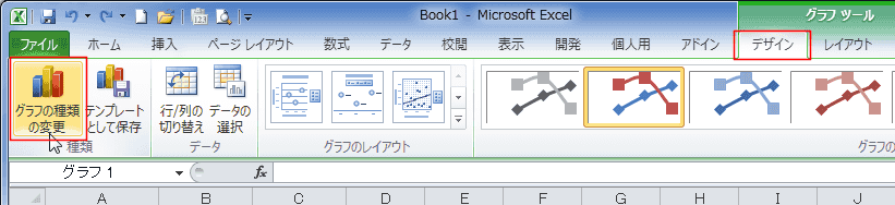 グラフツールの[デザイン]タブを選択し、[グラフの種類の変更]を実行します。
