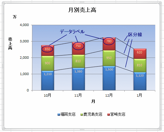 - 積み上げ棒グラフでの系列の境界をつないで表示する線
