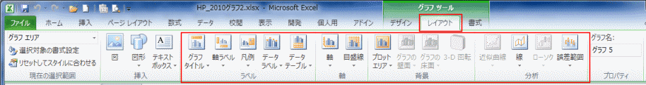 - グラフツール リボンの[レイアウト]タブにある各コマンドから表示や設定ができます。