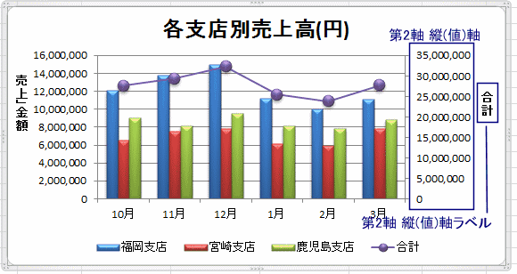 - 複合グラフなど値が異なるものを同じプロットエリアに収めるために、2つ目の軸を使うことができます。